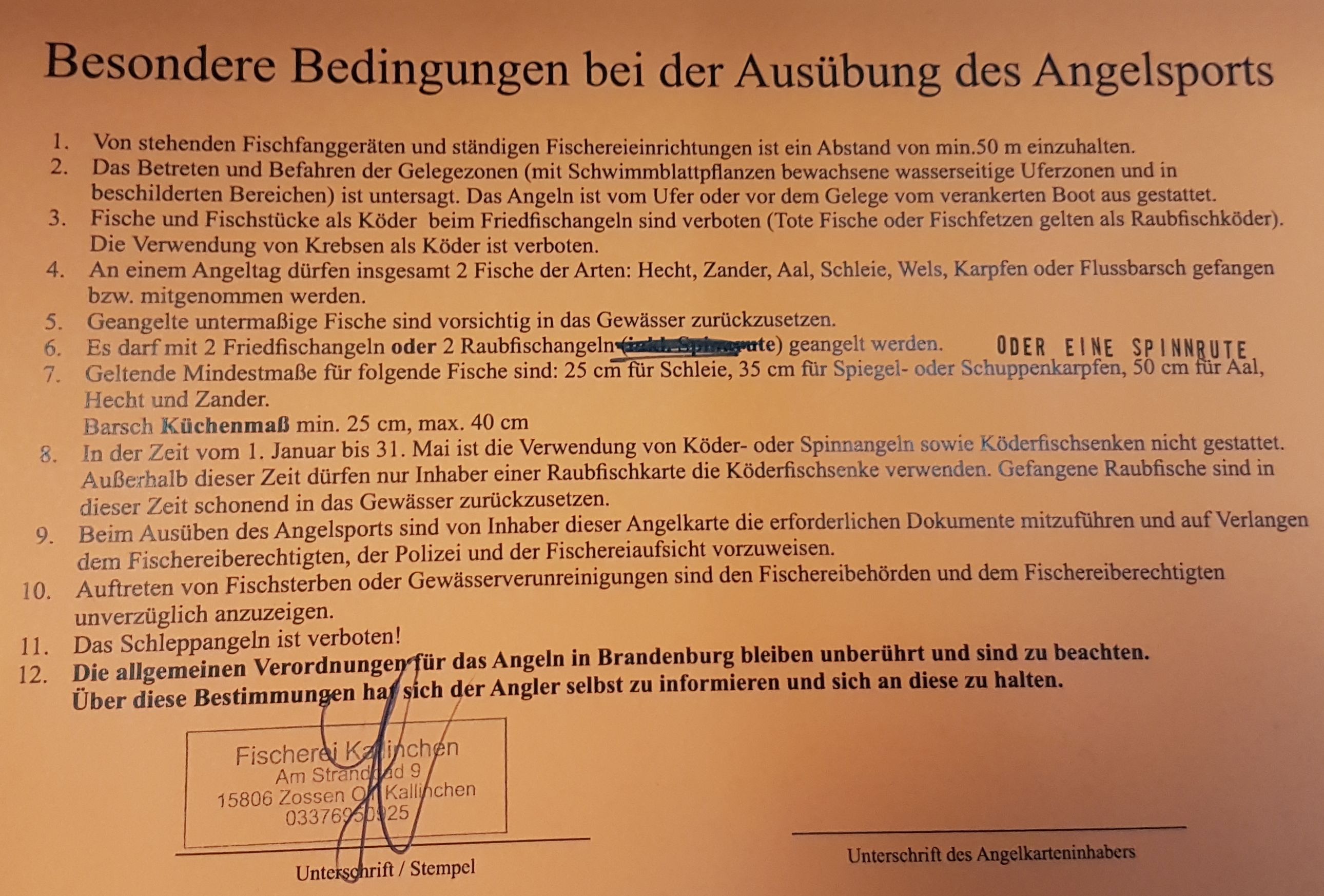 Tageskarte 15 € Angelkarten (und Fischereiabgabemarken) erhalten Sie in Groß Köris: Connys Haushaltwaren (Autobahnbrücke) |