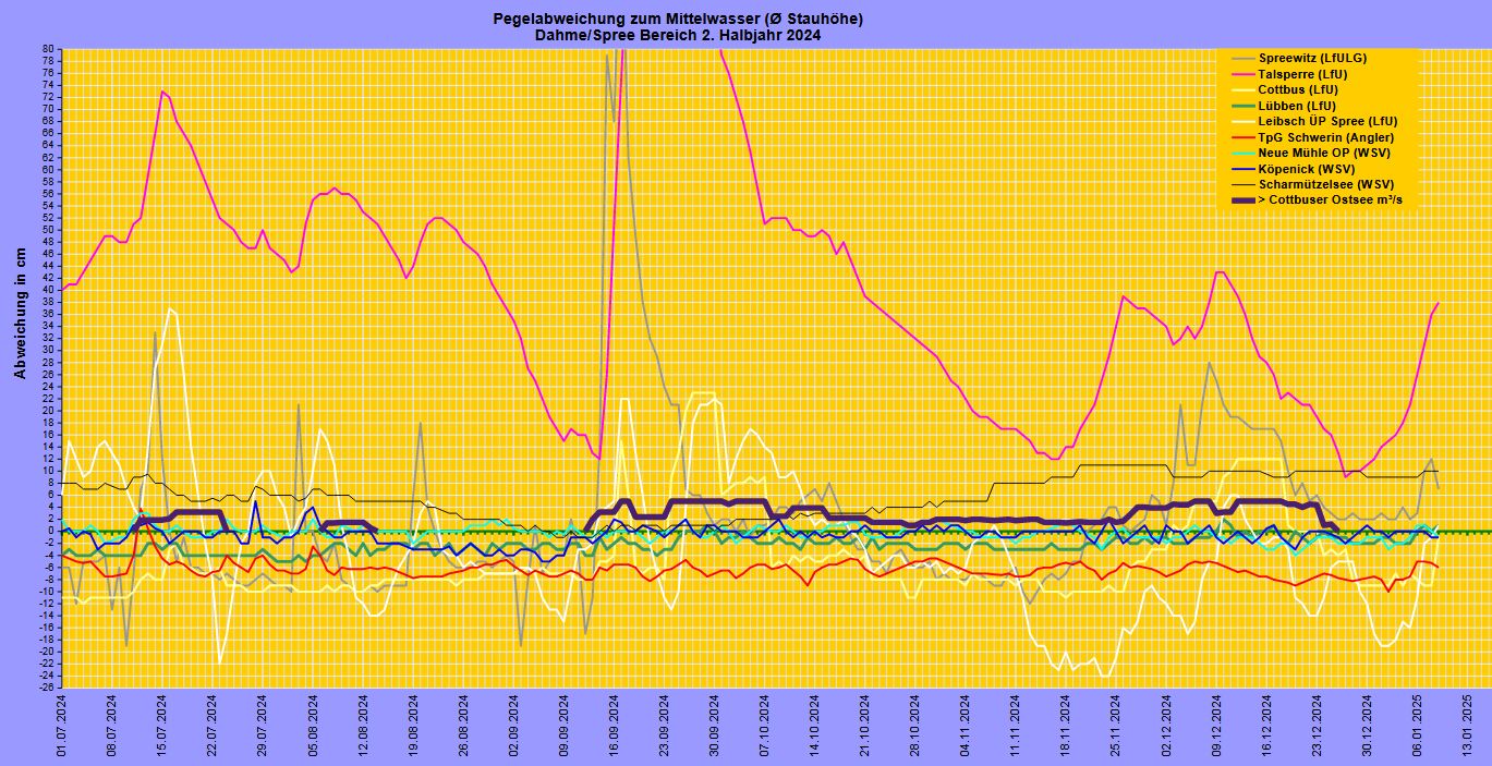 Im Wasserkreuz Prieros münden die Teupitzer Gewässer mit der Schmölde und die Storkower Gewässer mit dem Langen See in die Dahme, die über den Dolgensee in Richtung Königs Wusterhausen/Neue Mühle weiter verläuft. Erhöhte Abflüsse der Dahme können für einen verstärkten Rückstau, oberhalb der Einleitung in die Stauhaltung, gelegenen Gewässer (Teupitzer Gewässer) verantwortlich sein. |