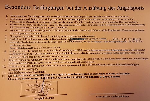 Tageskarte 15 € Angelkarten (und Fischereiabgabemarken) erhalten Sie in Groß Köris: Connys Haushaltwaren (Autobahnbrücke) |